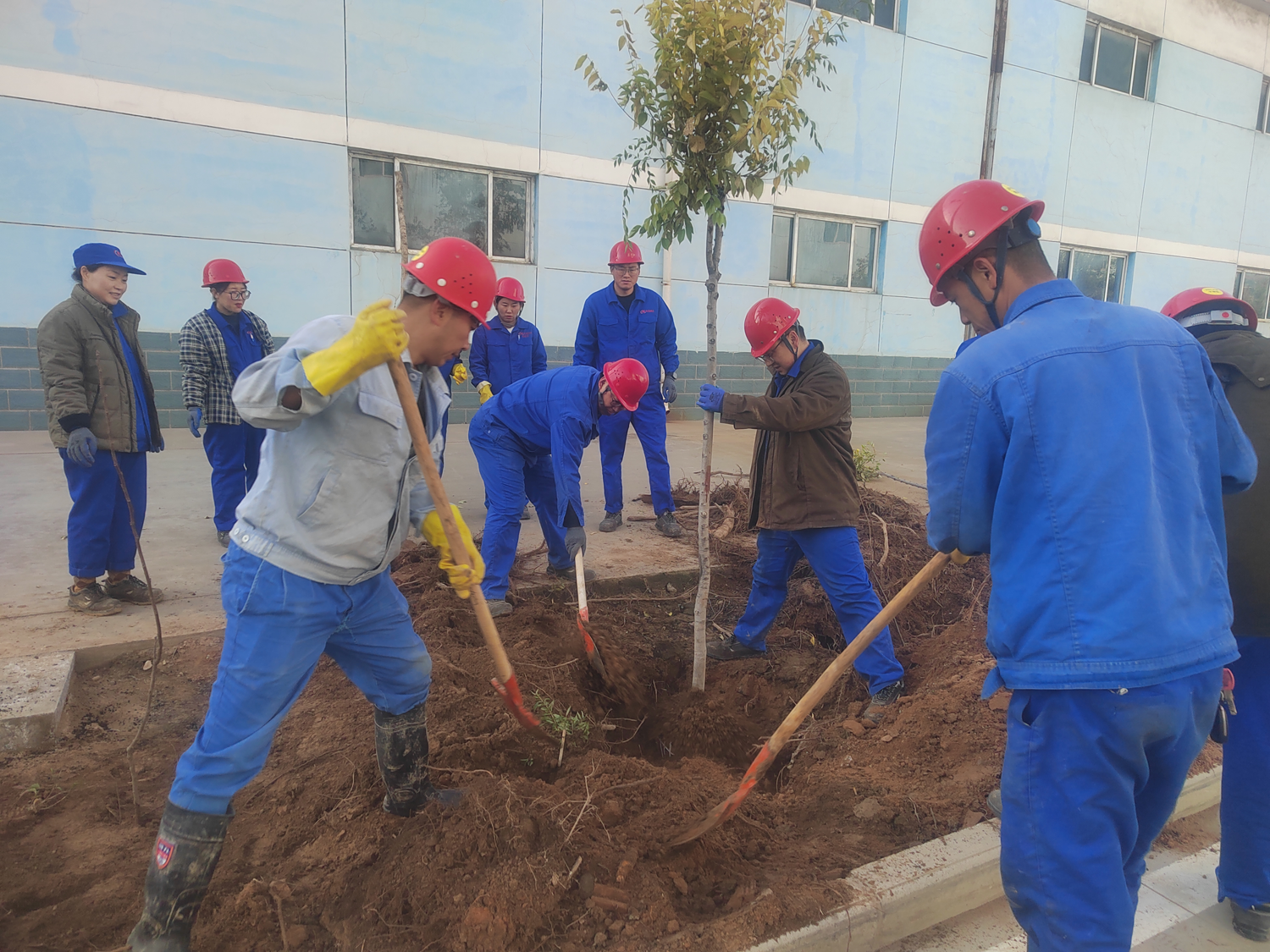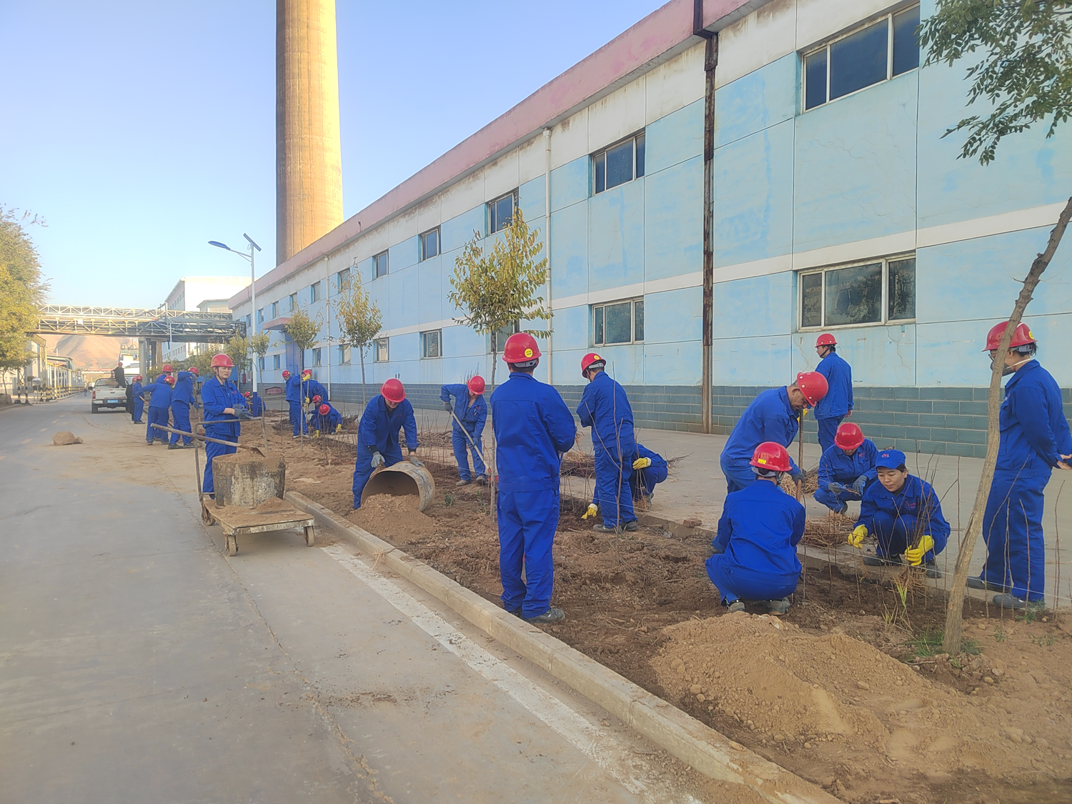 植树现场,广大党员干部职工不怕苦累、不畏寒意,热情高涨、干劲十足,按照划分区域和种植要求,三人一组、五人一伙,齐心协力、相互配合,挥镐扬锹、扶树正苗,培土夯实、提桶浇水,整个植树过程细致认真、有条不紊、有序进行。为确保补植工作的科学性和成活率,公司后勤保障中心绿化队提前对稀土厂区绿化区域补植补栽情况进行深入统计和调研,结合栽植区域的地块特点、土壤情况,精心挑选适宜补栽的树木品种,邀请专业人员对冬季补值的要求进行培训。经过大家共同努力,一棵棵树苗整齐排列、错落有致、迎风挺立,为稀土厂区重新披上了初冬新装。